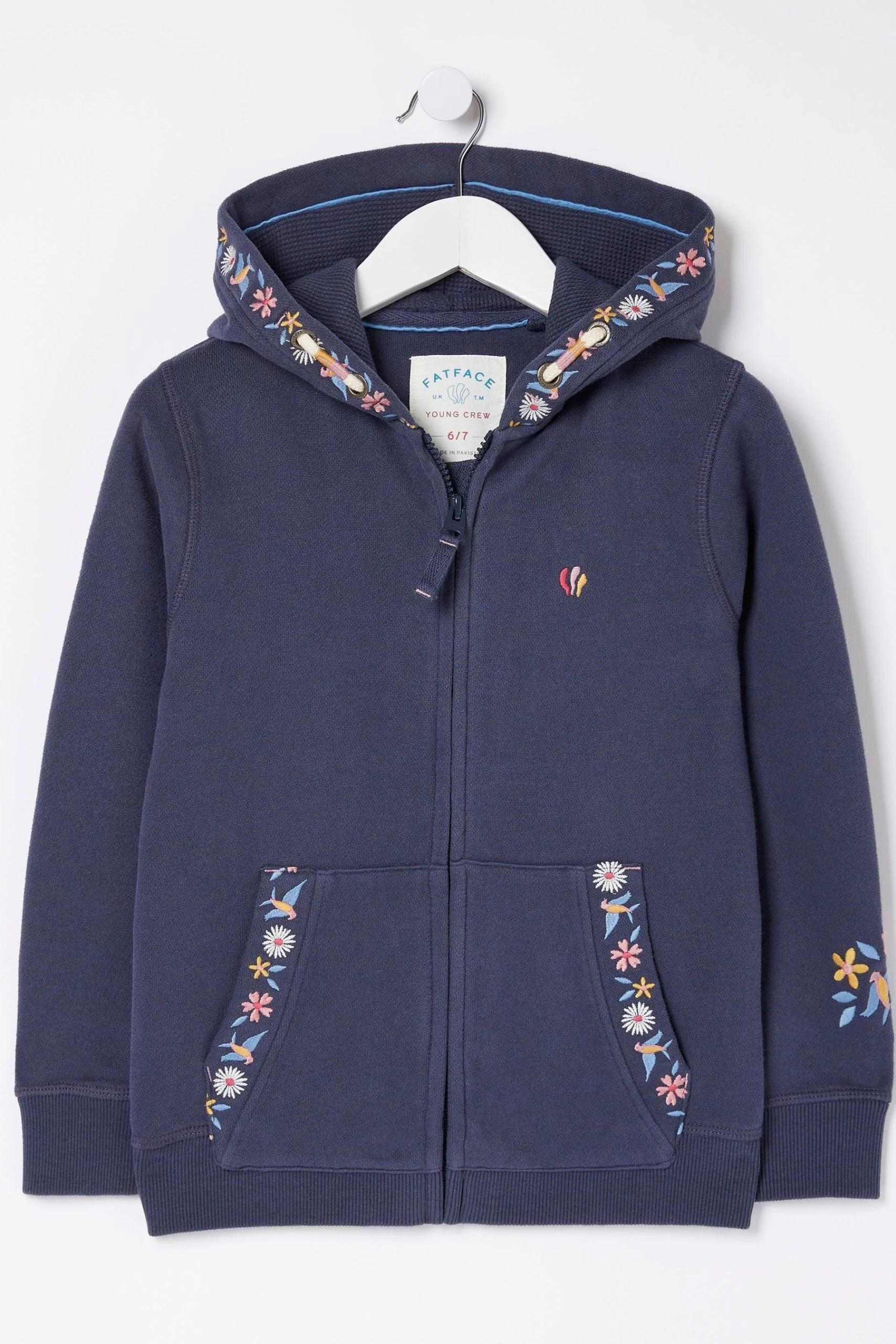 Layer your little one up when the temperature drops in this reliable zip through hoodie. Complete with beautiful embroidered detailing on the hood and side pockets, and ribbed cuffs and hem, this cotton-blend hoodie is warm, comfortable and ready for big adventures.