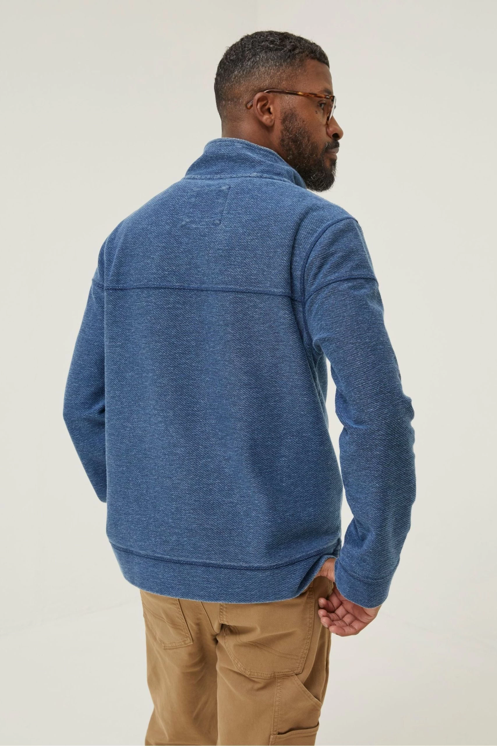 We've got the remedy to rid away your blues. Our indigo half neck is the perfect mix of comfort and style. Featuring a split hem, textured fabric and stitch detailing, you'll be reaching for this one come rain or shine. In a handy half neck, it's never been easier to throw on a morning fit and look effortless. Made in our super soft cotton polyester blend, transitioning through the seasons is simple. Layer with comfy tees underneath for chilly walks by the sea or style with light chinos for a fresh fit.