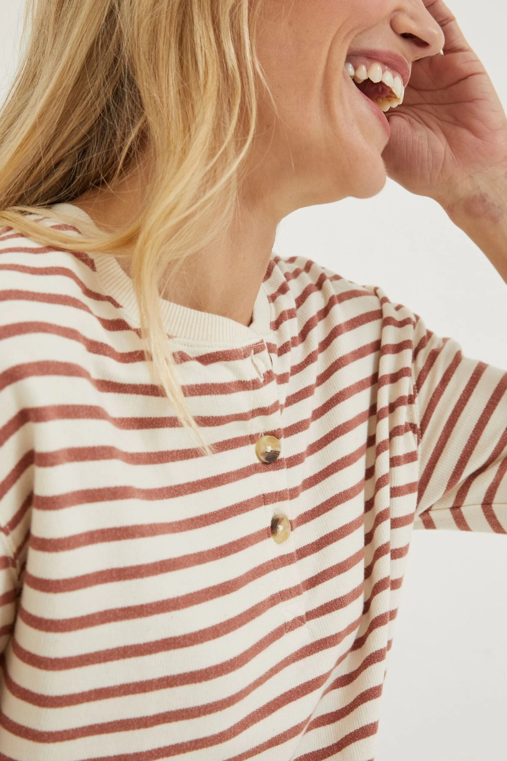 Oh-so-comfy, nothing beats a laidback sweat on casual days. Made from 100% supersoft and durable cotton, our Southbourne sweat looks as good as it feels. In a relaxed fit and classic stripe design, it's finished with a stylish tortoiseshell button-up neckline and three-quarter length sleeves.
