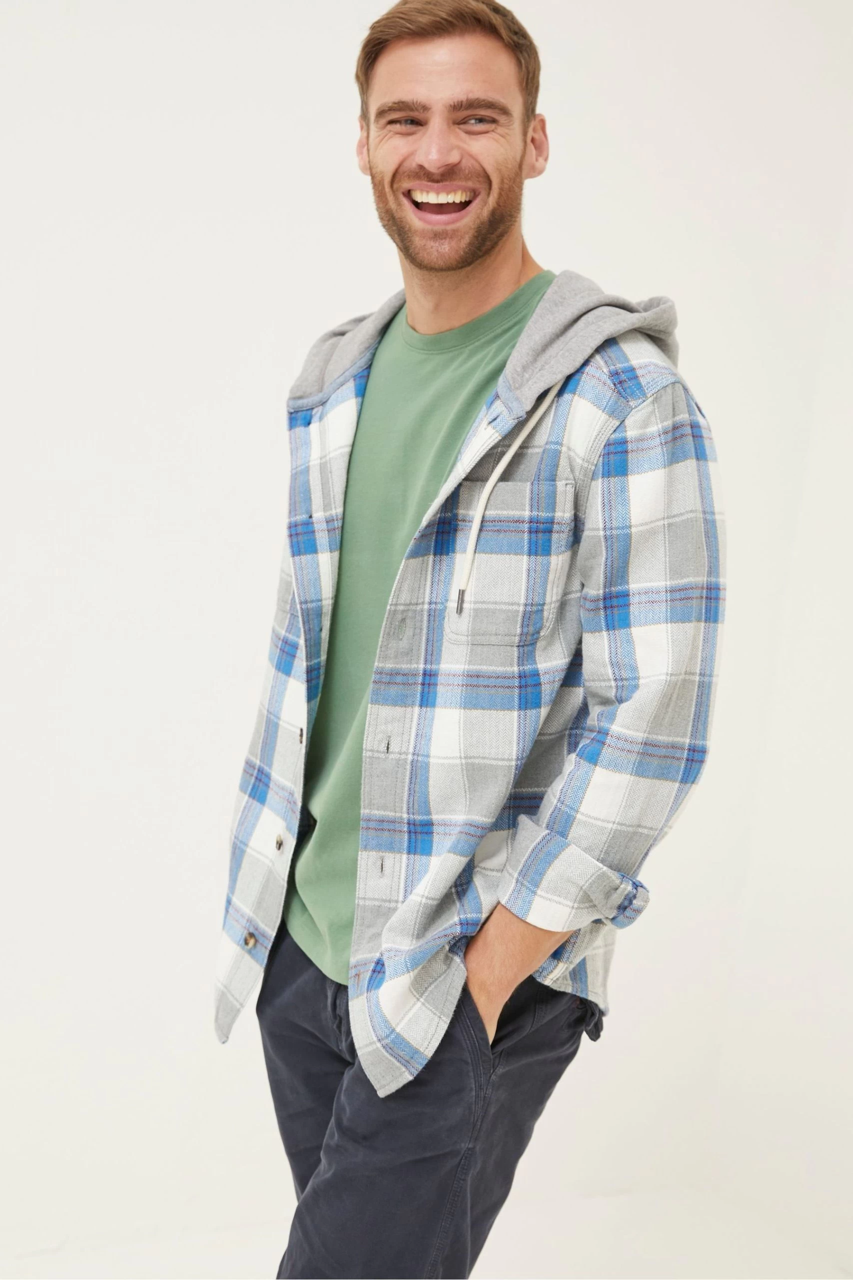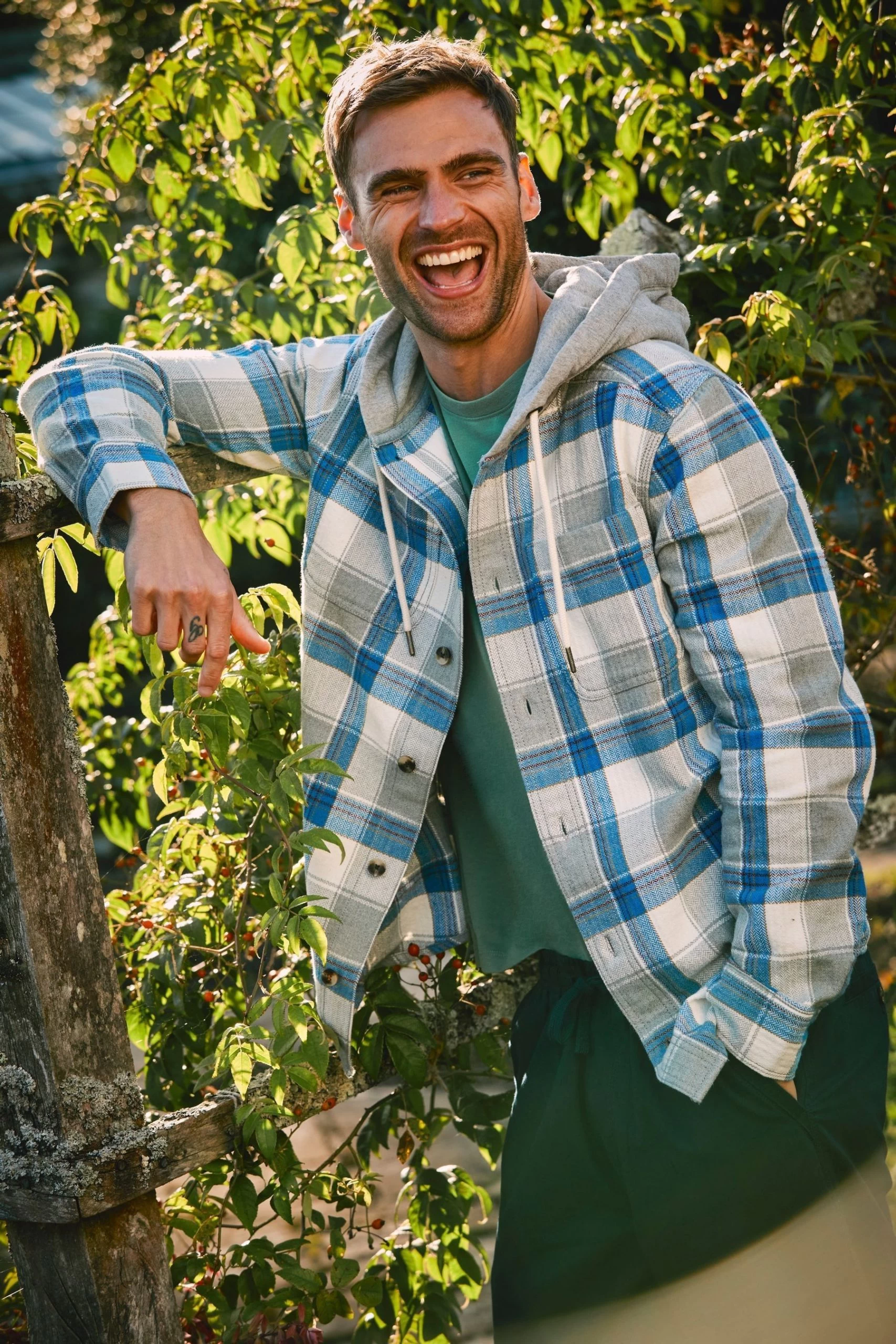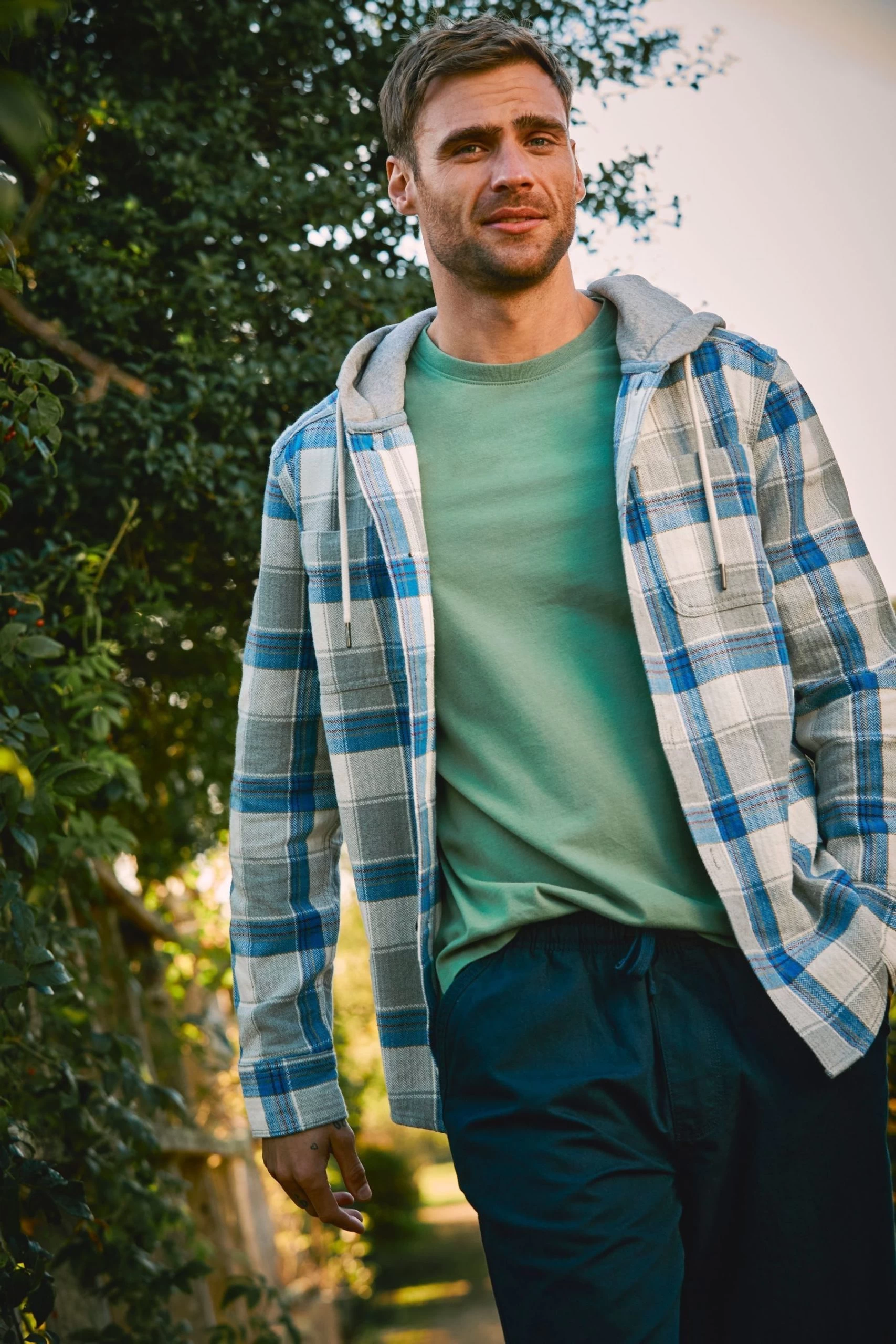 Get ready for warmer days with our hooded check shirt. This lightweight overshirt is perfect for cooler mornings, featuring an adjustable drawstring hood, twin chest pockets and a bold check design. Made from 100% BCI cotton for a soft breathable comfort. Try styling this with almost anything, from jeans on the weekend to shorts in the summer.